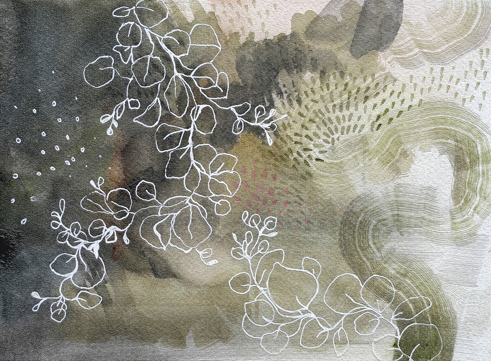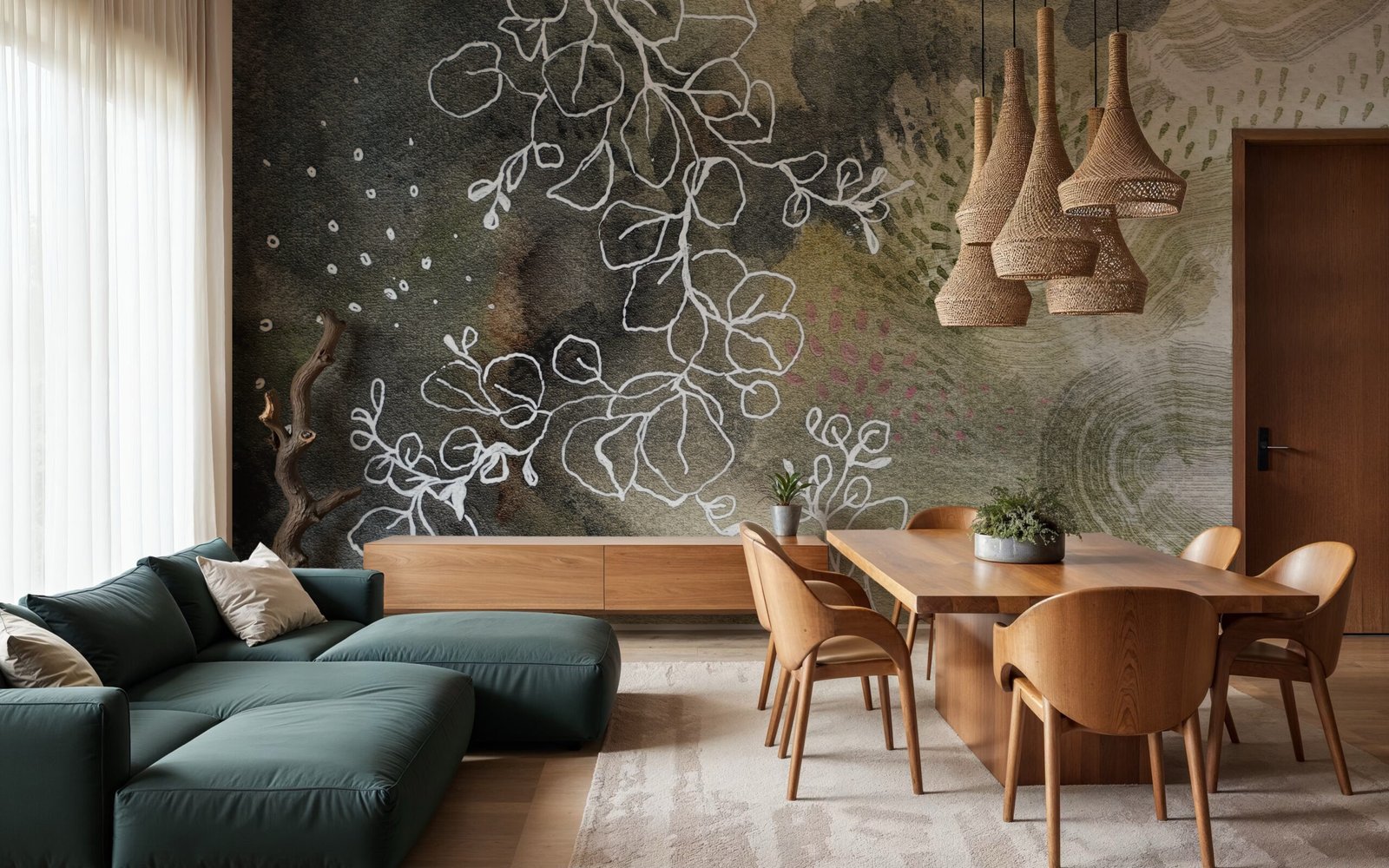 Organski oblici kreću se površinom u prigušenim zelenim i mineralnim tonovima. Kompozicija je mirna i stabilna te prostor čini otvorenim bez osjećaja praznine.